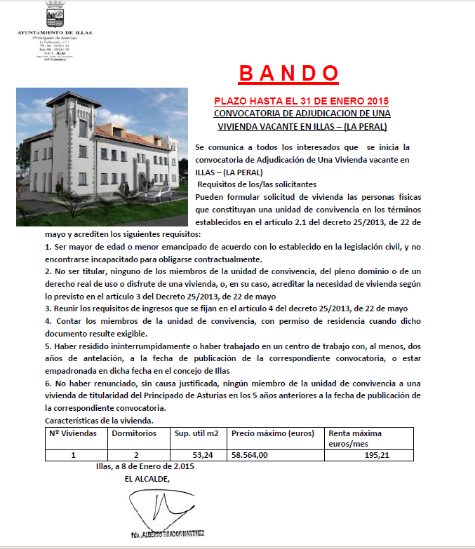 CONVOCATORIA DE ADJUDICACION DE UNA VIVIENDA VACANTE EN ILLAS ¿ (LA PERAL)